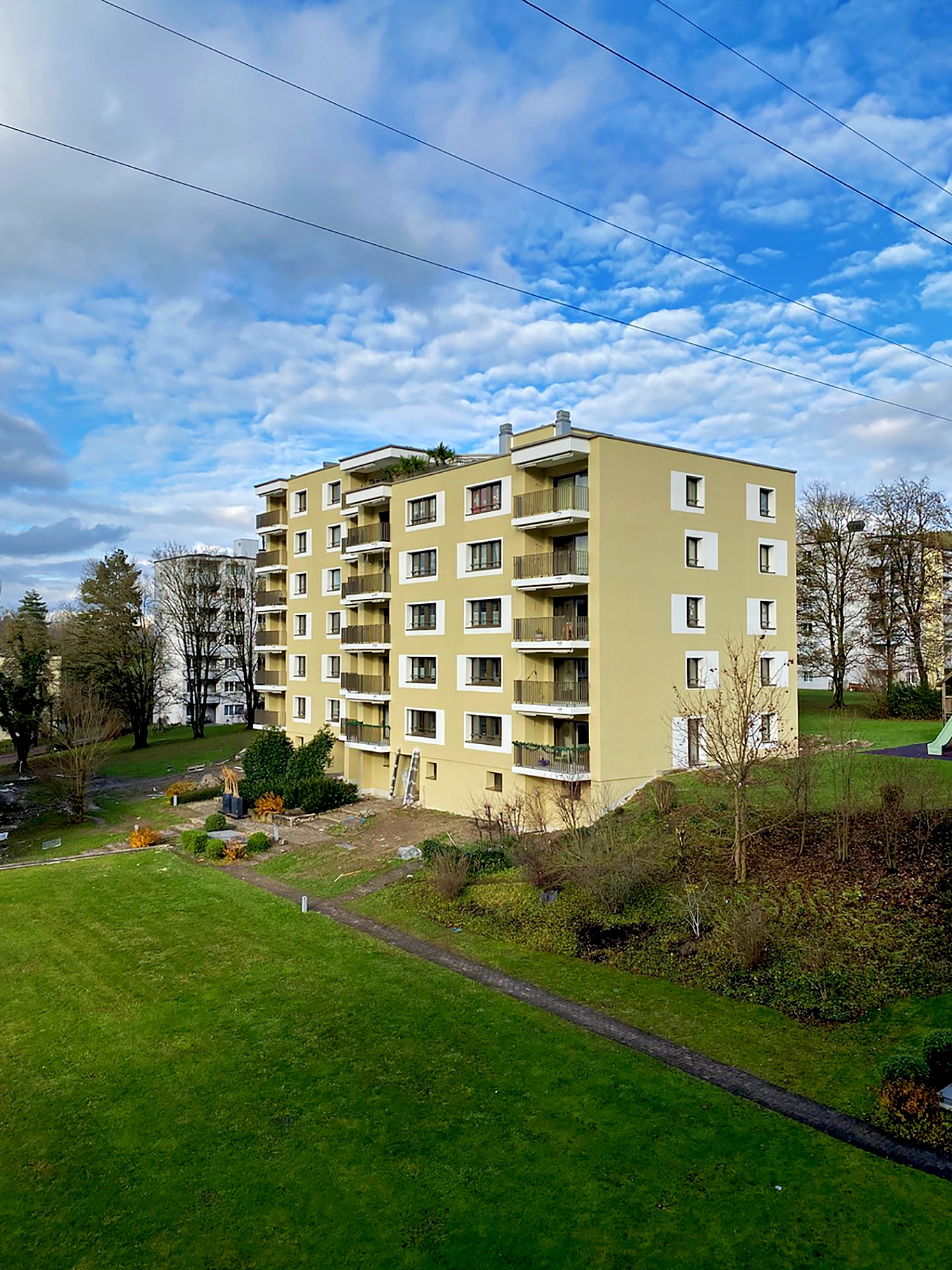 The façades of the eight buildings on Hofwiesenstrasse, initialy constructed in 1972, were renovated and redesigned in line with the latest ecological standards on the roof and façade. The existing balconies were freed from parapets and opened up. Exits and windows were enlarged and fitted with sliding doors to the outside areas. The roofs have been comprehensively equipped with a solar system.